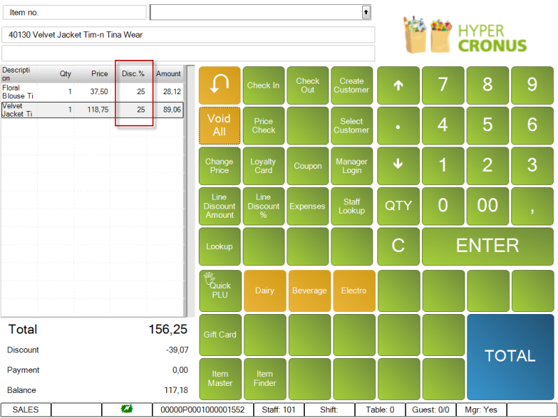 On the POS we first enter item 40120, Floral Blouse Tim-n Tina Wear. This item is in the Discount Offer Tim-n Tina Wear for 40 - 25% off displayed above.