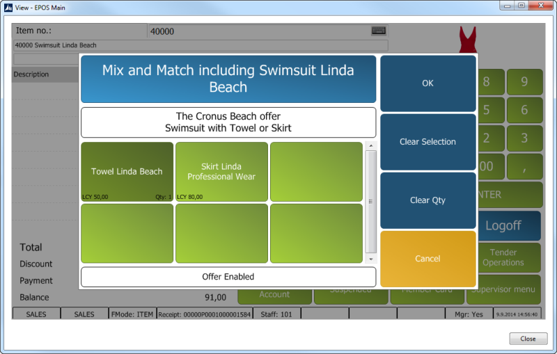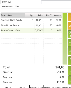 Now the POS user can inform the customer about the offer and in the bottom left corners the price is given for each item. Note: The information from the POS Pop-up FastTab is displayed on the white frame. If Towel Linda Beach is selected the offer is triggered: