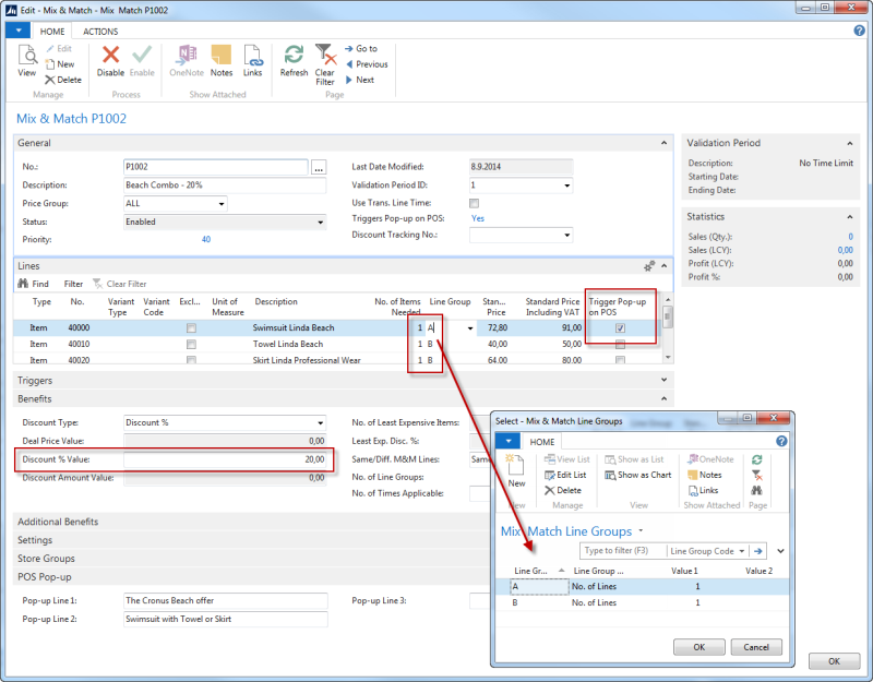 In this example a pop-up window is added to a Mix & Match offer. The offer includes item no. 40000 - Swimsuit Linda Beach as a main item and items 40010 - Towel Liz Beach and 40020 - Skirt Linda Professional Wear. Note that all lines must have the Type Item. The setup for the Mix & Match Line Group has two line groups, A and B and the value 1 in both of them. This means that you have to buy one item in group A and one item in group B to trigger the Mix & Match Offer. Both item no. 40010 and 40020 are in group B, so you can chose between either one of them to trigger the Mix & Match Offer combined with item 40000 on the POS.