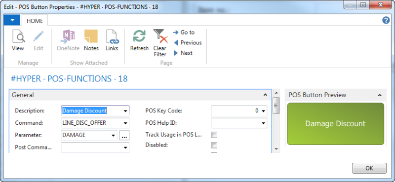 A typical way to use Line Discount Offer is to use it to control how much discount to give when item is damaged in some way. By creating a Discount group and setting up discounts in the group to cover all possible and acceptable discounts for damaged items, it is possible to have a range of offers covering each category of the operation or even one offer covering everything. After creating and setting up the offer the only thing needed is to define a button on the POS to activate the selection of the best offer within a given Line Discount Group.