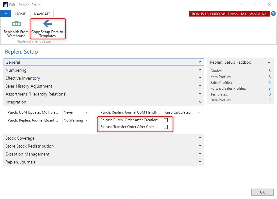 When a Template is created, the settings from the Replen. Setup are copied to the new Template. The action Copy Setup Data to Templates on the Replen. Setup page overwrites the settings in all existing Templates with the current settings in the Replen. Setup.